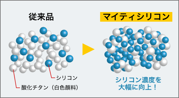 新たなシリコン塗料、マイティシリコンを開発するにあたって、ガイソーが目指したのは塗料としての確実な性能向上です。塗料は様々な原料を組み合わせて作られていますが、まずシリコンの濃度を大幅に高めることで、基本性能の向上を目指しました。従来品よりも大幅に向上したシリコン濃度により、マイティシリコンは極めて緻密で頑強な塗膜を形成します。