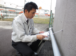 ガイソーではお客様にお住まいの状態をその目でしっかりご確認いただくため、診断時には必ず立ち会っていただいております。右のような打診棒などを使って外壁材の「浮き」なども調査いたします。